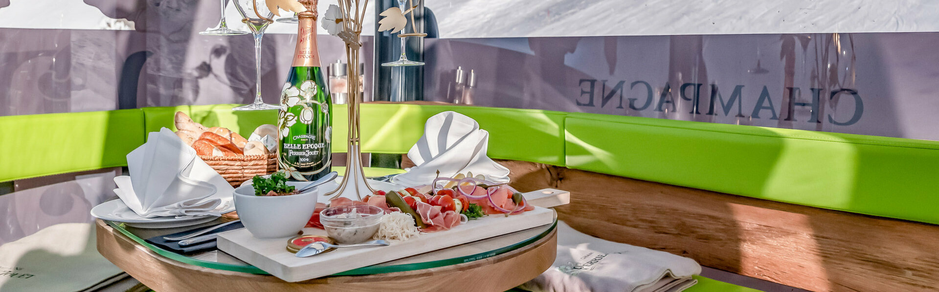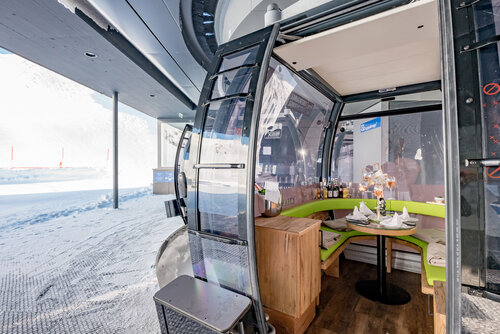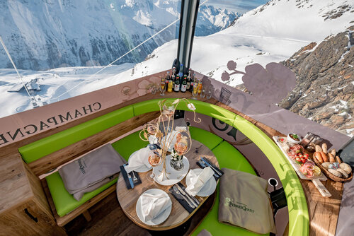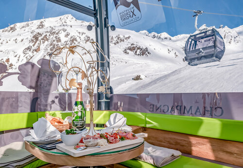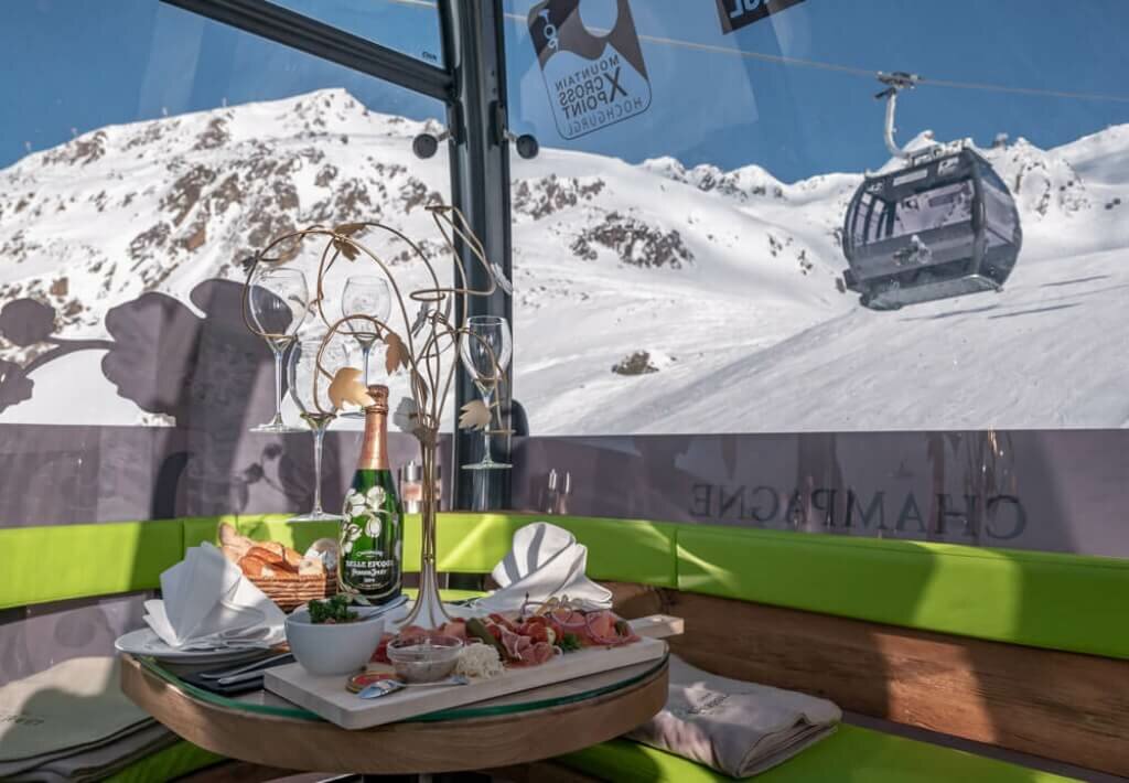 Direkt an der Timmelsjoch Hochalpenstraße – am TOP Mountain Crosspoint – können Sie ein außergewöhnliches kulinarisches Bergerlebnis genießen: die Perrier-Jouët Genussgondel der Kirchenkarbahn!
