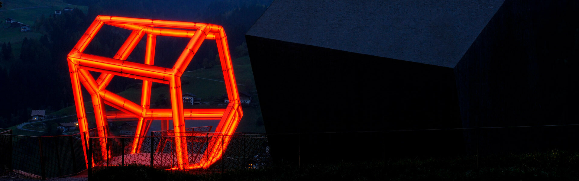 Auf dem Felshang bei Stuls eröffnet sich ein spektakulärer Ausblick auf Moos und das hintere Passeiertal. Zwei Granaten – den geologischen Gesteinsformationen des Passeiers nachempfunden – dienen als Schauraum und Aussichtsplattform.