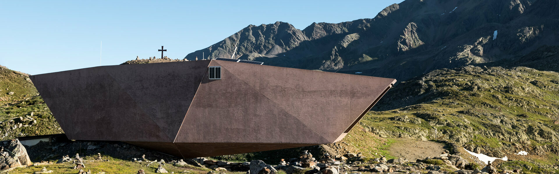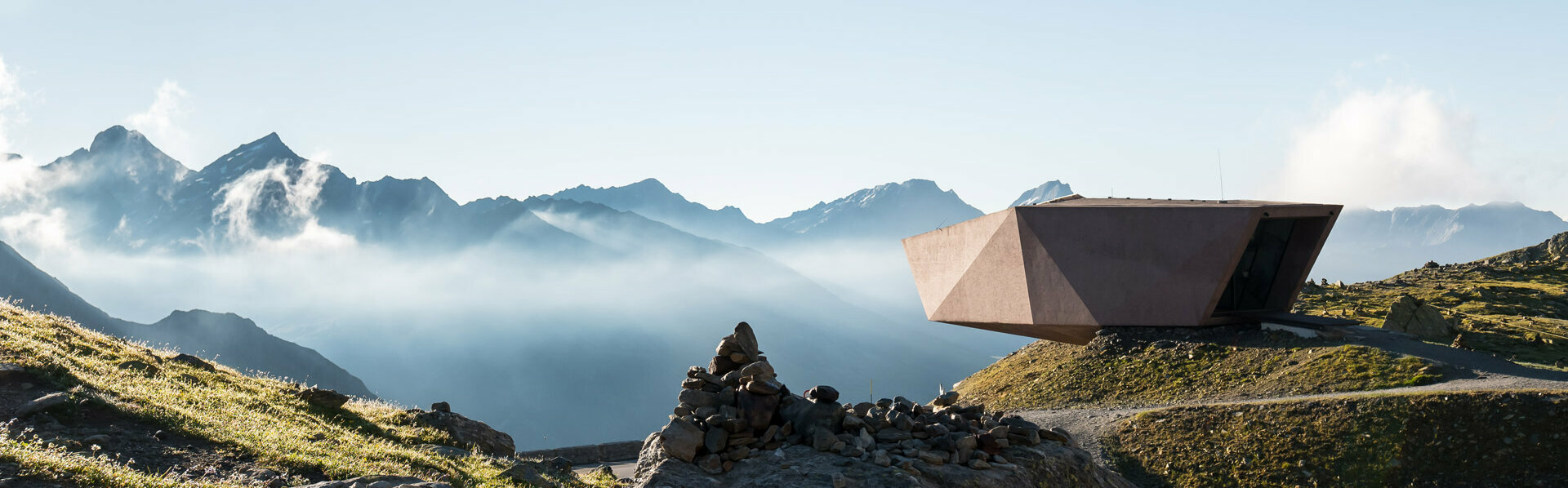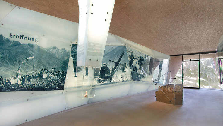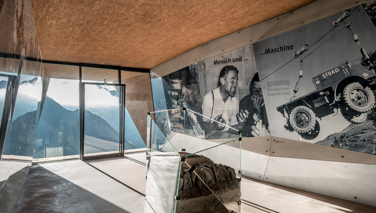 Wie ein Findling ragt das neue Passmuseum von Tiroler auf Südtiroler Seite hinaus und unterstreicht den grenzüberschreitenden Charakter der Timmelsjoch Erfahrung. Die „Eishöhle" im Inneren zollt den Pionieren der Hochalpenstraße und ihrer bemerkenswerten Leistung Tribut.
